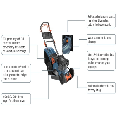 Featuring a 51cm cutting deck with a 3-in-1 convertible design, it allows side discharge, mulching, or rear bagging of grass clippings, adapting to your lawn care preferences. The 60L grass collection bag includes a full indicator, making disposal easy and efficient. For added convenience, the deck is equipped with a water connection, enabling quick and simple cleaning without removal.