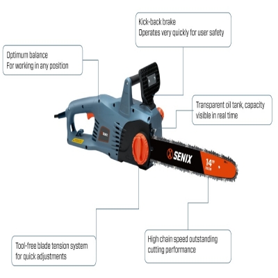 The SENIX 1800W 35cm (14”) Electric Chain Saw is designed for homeowners and garden enthusiasts who need a lightweight, safe, and reliable cutting tool. Its 1800W motor delivers sufficient power for medium-duty tasks, while the 14 m/s chain speed ensures fast and smooth cutting of branches, firewood, and other yard materials.