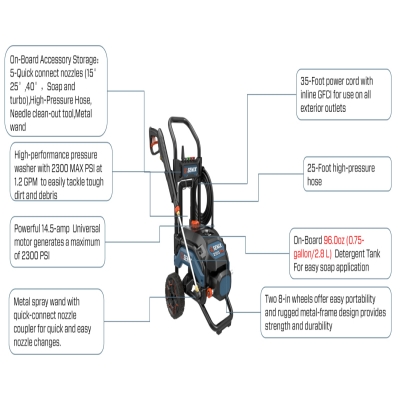(5.0)Exceptional Cleaning Power – 14.5-amp universal motor delivers up to 2300 PSI at 1.2 GPM, tackling tough grime, dirt, and mildew effortlessly.