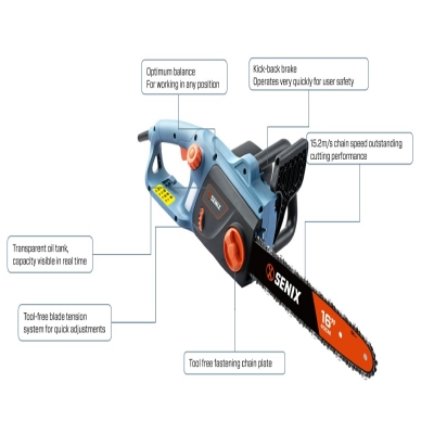 The SENIX 2400W 40cm (16”) Electric Chain Saw is engineered for high performance, safety, and user comfort, making it suitable for homeowners, gardeners, and semi-professional users. Powered by a 2400W motor with a no-load speed of 8000 RPM and a chain speed of 14.5 m/s, it delivers fast, efficient cutting through firewood, branches, and medium logs.