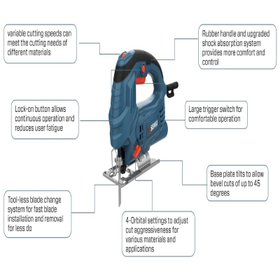 Its base plate tilts up to 45° for bevel cuts, expanding the versatility for angled or complex work. The tool-less blade change system simplifies blade installation and removal, saving time and improving workflow. For enhanced comfort, the jig saw features a rubber handle and an upgraded shock absorption system, reducing vibration and user fatigue during prolonged use.