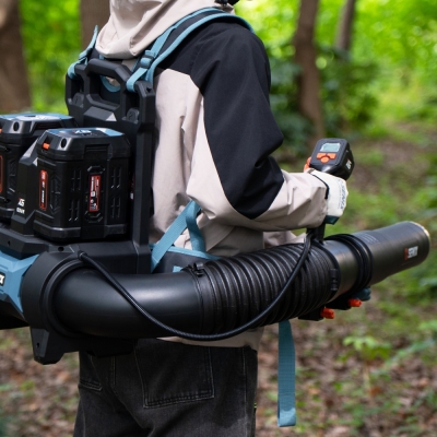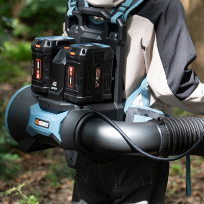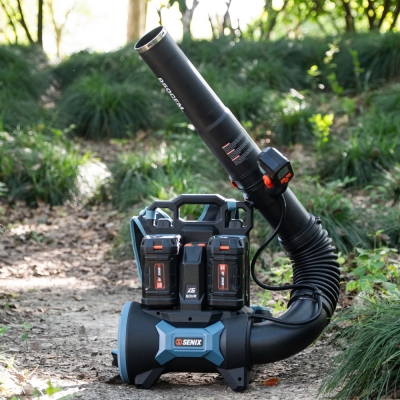 The SENIX 60V 950 CFM Backpack Blower delivers exceptional power with a 2400W brushless motor and adjustable 4-speed control. Built for performance and comfort, it features a dual battery system, ergonomic harness, and operator-adjustable handle and nozzle for long jobs in any condition.