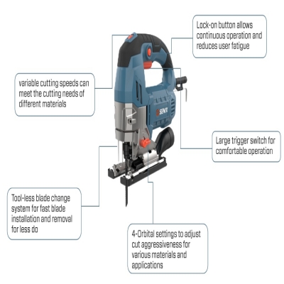 The SENIX 750W 26mm (1-1/32") Jig Saw is engineered for precise and versatile cutting across a range of materials, including wood, aluminum, and steel. Equipped with a 26mm stroke length and variable speed control from 1500 to 3100 RPM, this tool offers excellent adaptability, allowing users to adjust the cutting speed to match the material and application requirements.