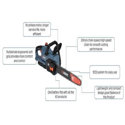 (5.0)The SENIX 40V Brushless 35cm (14") Chain Saw combines power, precision, and portability. Equipped with a high-speed 20m/s chain and a durable brushless motor, it delivers smooth, efficient cutting. Lightweight, compact, and ergonomically designed with a rubber-grip rear handle and SDS system, this chainsaw offers superior balance, easy handling, and compatibility across all X2 batteries—ideal for woodcutting tasks of any scale.