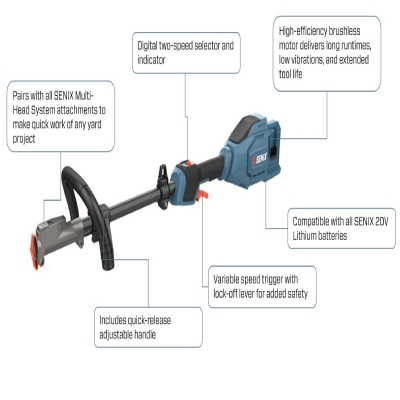 Lightweight at just 3.0 kg (6.6 lbs) and built with a durable aluminum pipe, the power head is easy to maneuver and transport. The variable speed trigger with lock-off lever adds a layer of safety and precise control during operation. Additionally, it pairs seamlessly with all SENIX 20V Lithium batteries, offering extended runtimes without the hassle of multiple chargers.