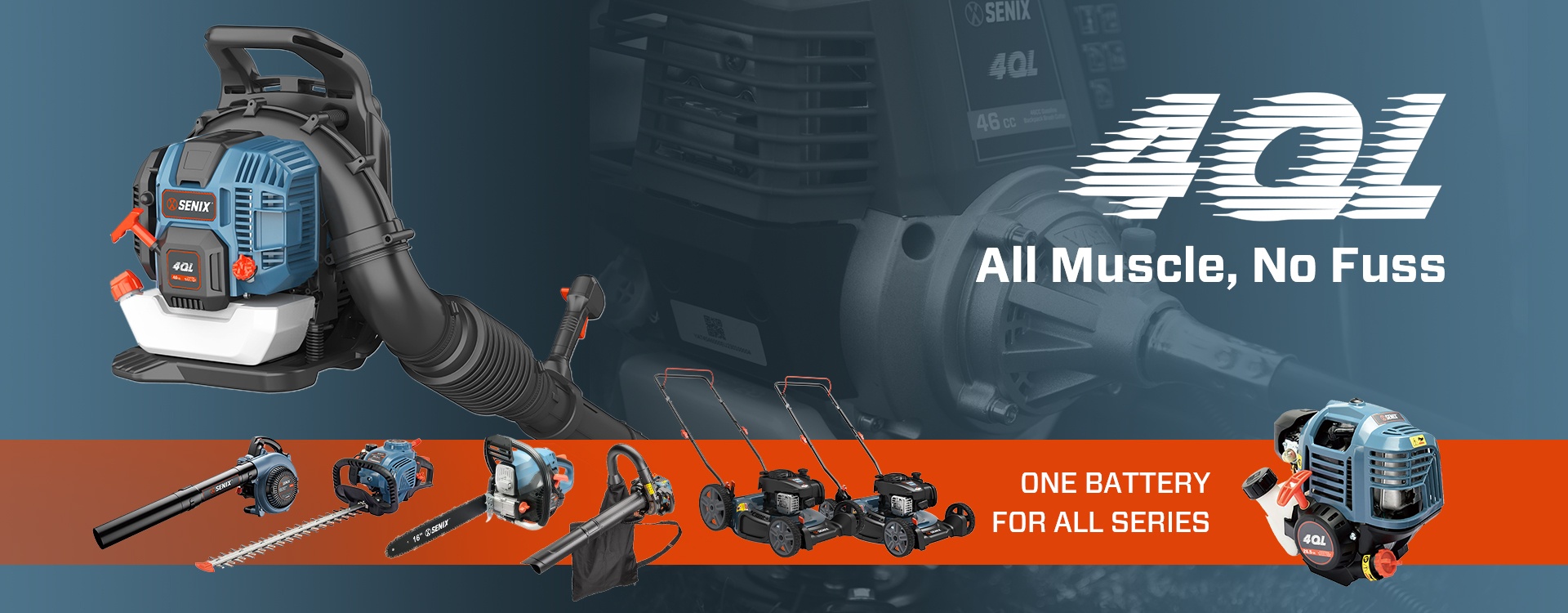 The SENIX gas-powered landscaping equipment lineup offers robust solutions for outdoor tasks. Some models are equipped with SENIX’s patented 4QL® 4-cycle engine, which prevents stalling, leaking, and keeps lubricated in all directions, ensuring cleaner, smoother operation. If you're considering clean energy, explore the SENIX X6 series—our advanced, lithium battery-powered garden tools designed for powerful, cordless performance.