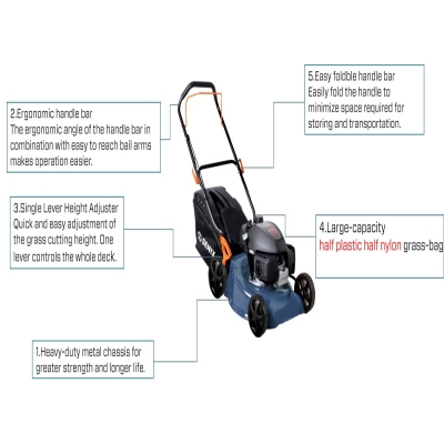 The easy-fold handle bar makes storage and transport convenient, fitting neatly into sheds or garages. With its hand-push drive system, users enjoy straightforward operation without complicated mechanisms.
