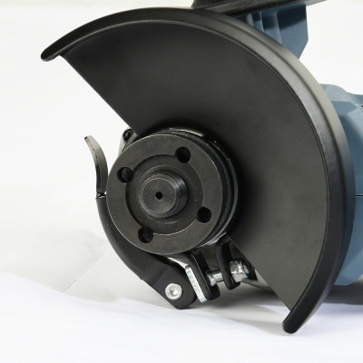 A: Electric brake stops the disc quickly; safety guard protects from debris (tool-free adjustable).