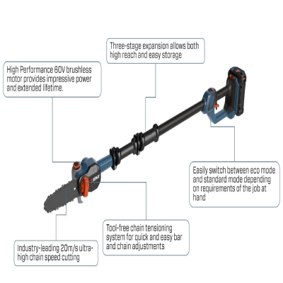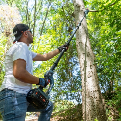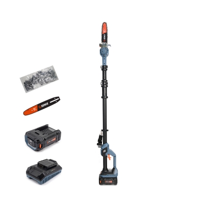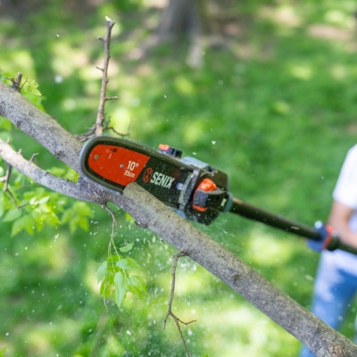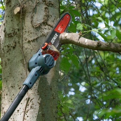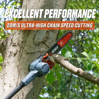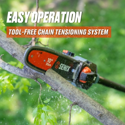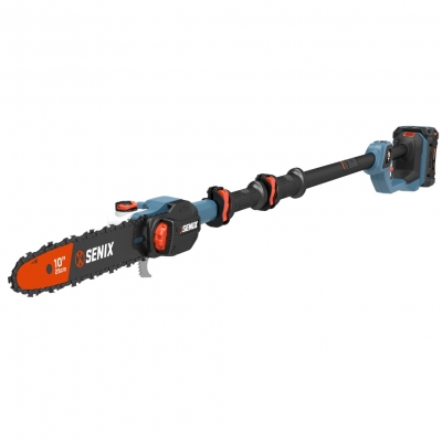 The SENIX 60V Brushless 25cm (10'') Pole Saw is built for power, reach, and control. With a potent 1000W brushless motor, it achieves a top chain speed of 20 m/s for rapid cutting of overhead branches and hard-to-reach limbs. The adjustable telescopic pole extends from 1.4 to 2.6 meters, giving users excellent vertical reach without the need for a ladder.